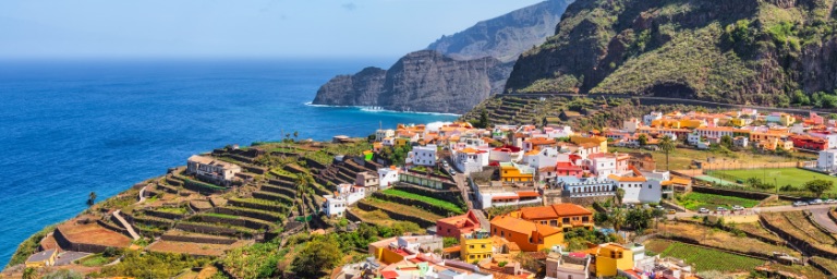 A cliffside town by the sea, filled with bright orange and white buildings and green landscape.