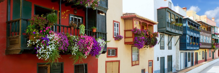 Large flower arrangements hang from the balconies of colorful buildings along a sunny street.