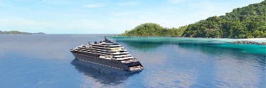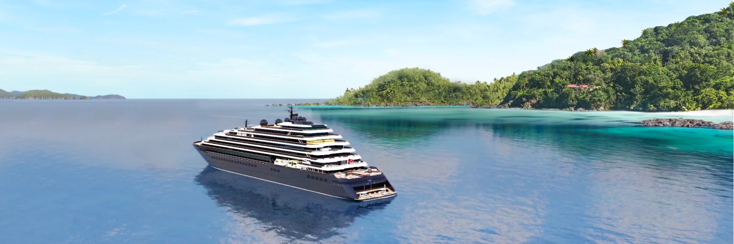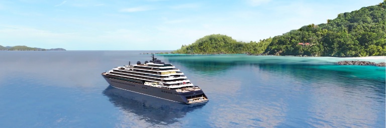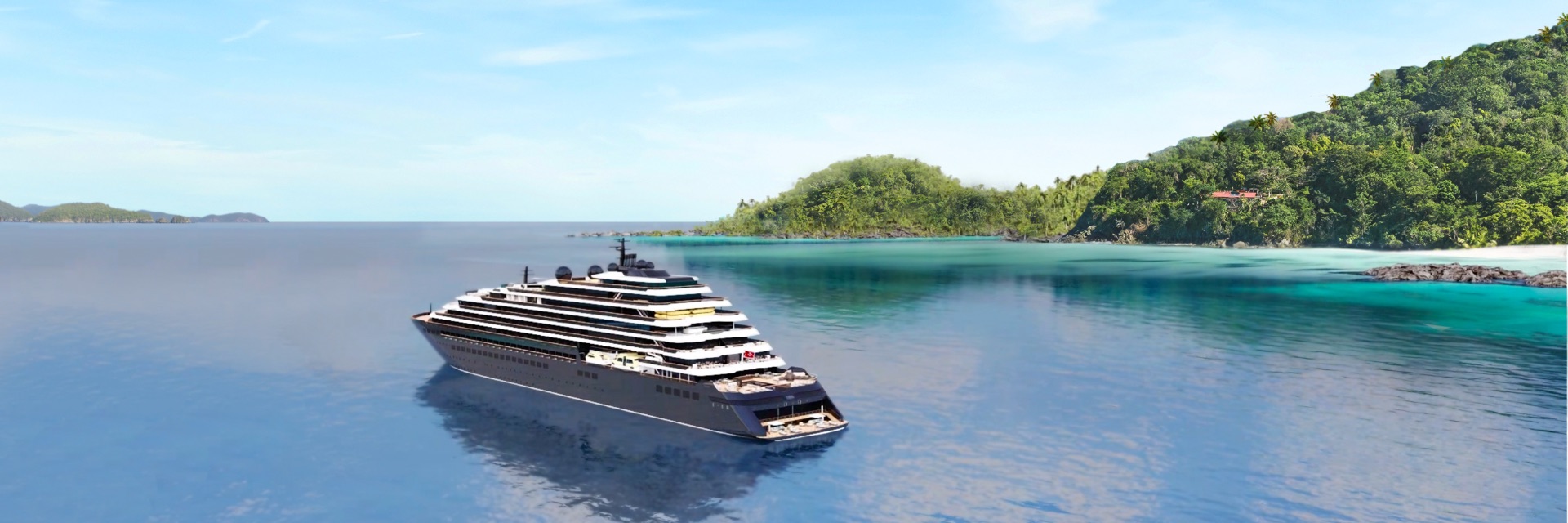 Bright blue water surrounds the Evrima.