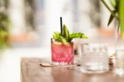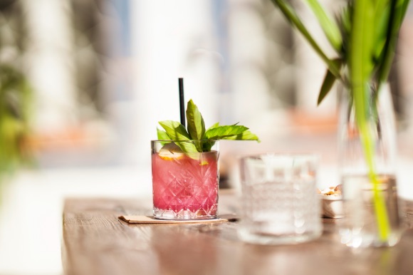 A pink cocktail in a rocks glass garnished with fruit and green herbs.