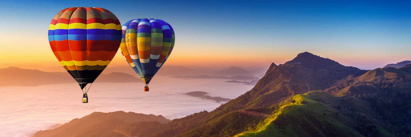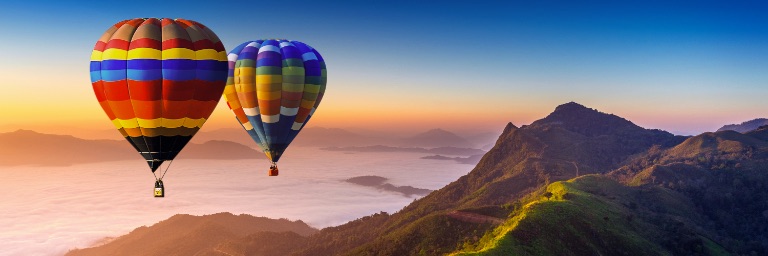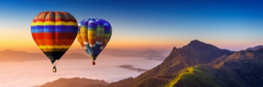 Two multi-colored striped hot air balloons fly above a mountainous landscape at sunset.