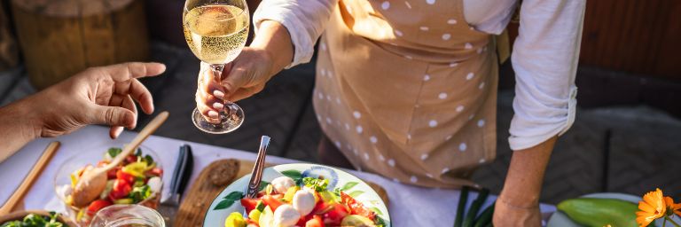 A person hands a glass of white wine to another person over a dining table topped with salads.