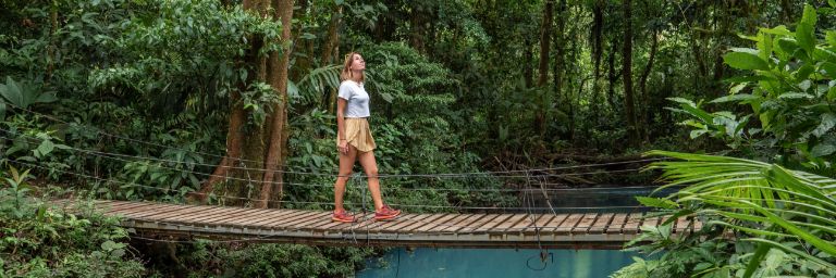 A woman walks across a wooden foot bridge over blue water, surrounded by green trees.