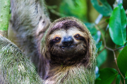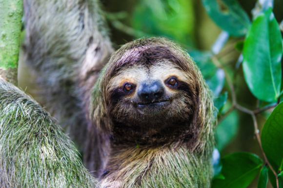 The close-up look at a sloth smiling directly at the camera.