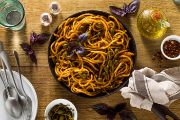 Top-down view of a bowl of bucatini pasta with pesto and caper berries.
