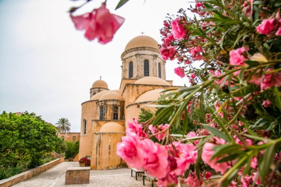An old monastery in Chania, on the island of Crete, Greece, framed by pink flowers in the foreground.