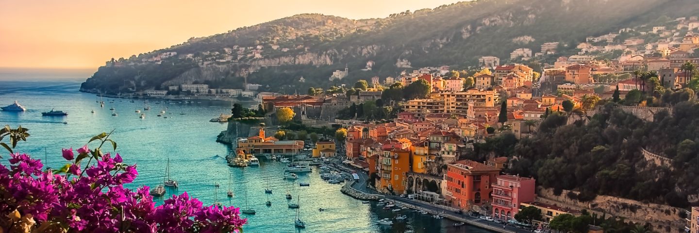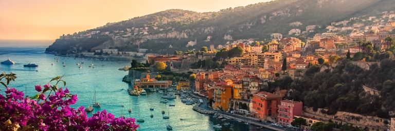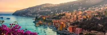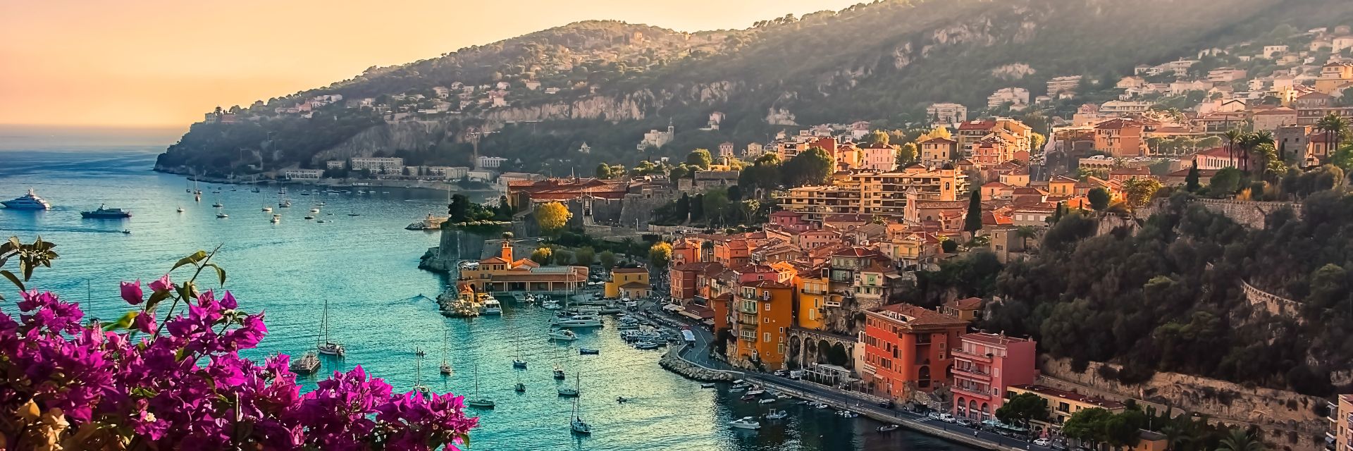 Sun sets over a hillside covered in colorful houses, sitting in front of the bright blue sea.