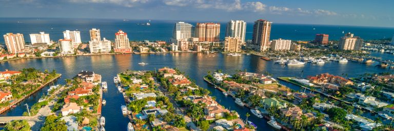 An aerial view of Fort Lauderdale's Intracoastal waterway of canals and inlets, with the Atlantic Ocean in the distance.