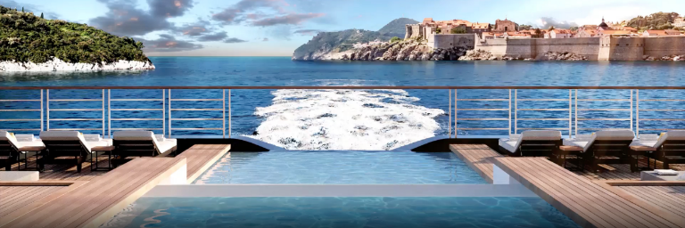 A rendering of Evrima's infinity pool, looking aft with Dubrovnik in the background.
