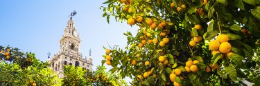 A lemon tree with a cathedral in the background.