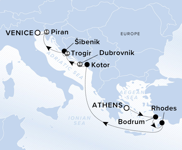 A map showing the Adriatic Sea, Aegean Sea, and Ionian Sea. A line shows the voyage route from Athens to Bodrum, Rhodes, Kotor, Dubrovnik, Trogir, Šibenik, and Venice.