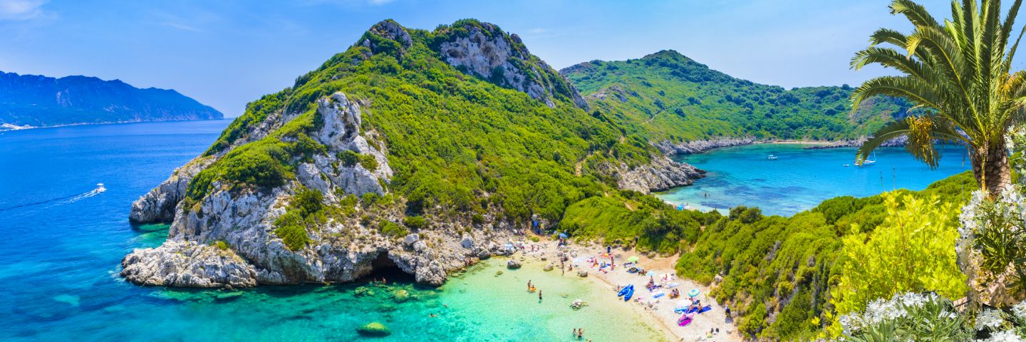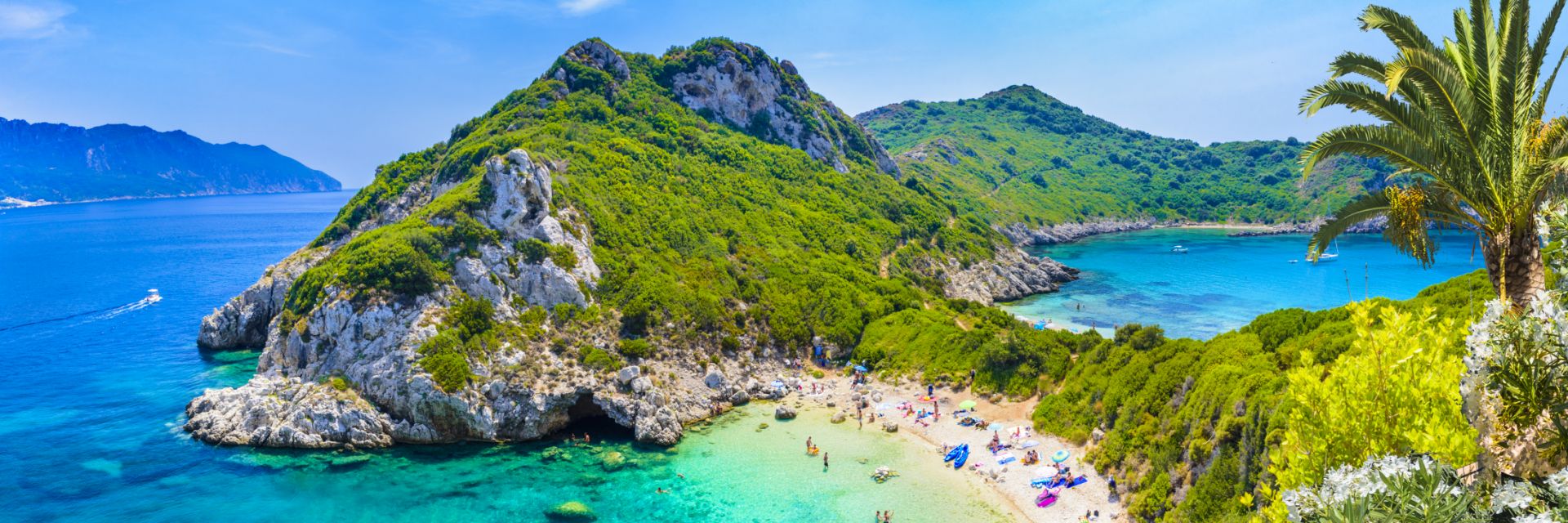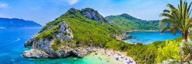 The blue water beaches and green hills of the twin bays of Porto Timoni located in Corfu, Greece.