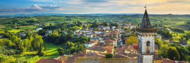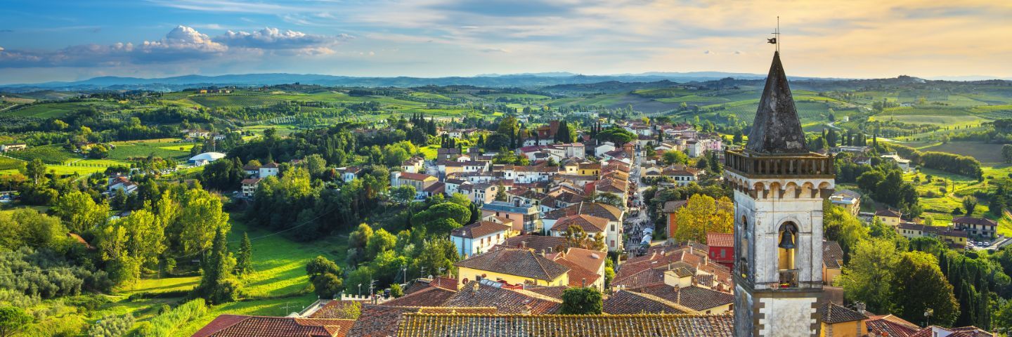 The aerial view of Florence, Tuscany, with a church and bell tower in the foreground.