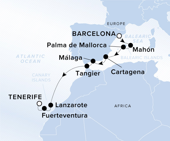 A map showing the Balearic Sea and Atlantic Ocean. A line shows the voyage route from Barcelona to Málaga, Tangier, Casablanca, Lanzarote, Feurteventura and Tenerife.