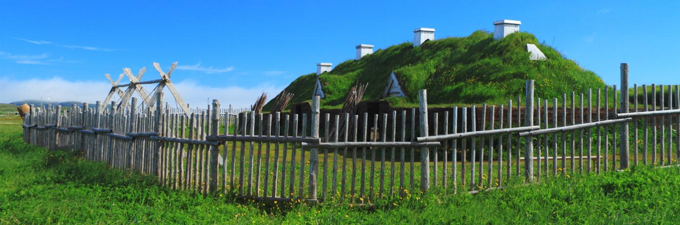 Bright blue sky and bright green green cover a mound of Ancient homes of Viking settlers in L'Anse aux Meadows national historic site, surrounded by fence.