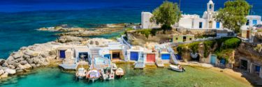 A quaint Mediterranean harbor with small sailboats at anchor and whitewashed buildings with colorful trims in the background.