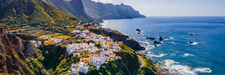 A colorful coastal town on the cliffs of Tenerife, Canary Islands, overlooking the ocean.