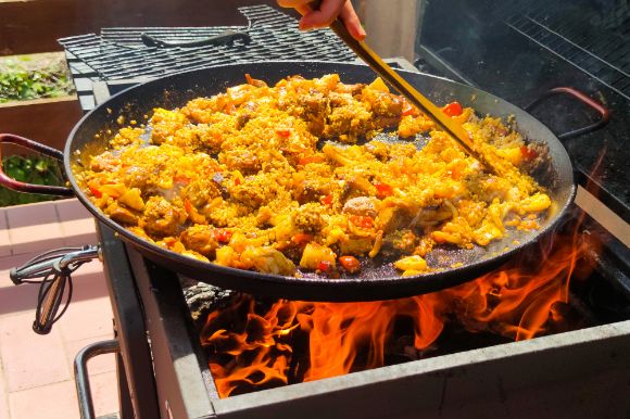 A close-up look at the traditional Spanish dish of paella being cooked on an open fire.