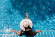 The aerial view of a person wearing a large straw hat reclining in the pool.