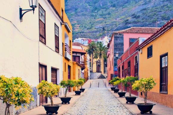 A cobblestone street lined by colorful Mediterranean-style buildings.