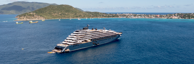 An image of Evrima anchored out in the Caribbean with the Marina open and water toys in the ocean.