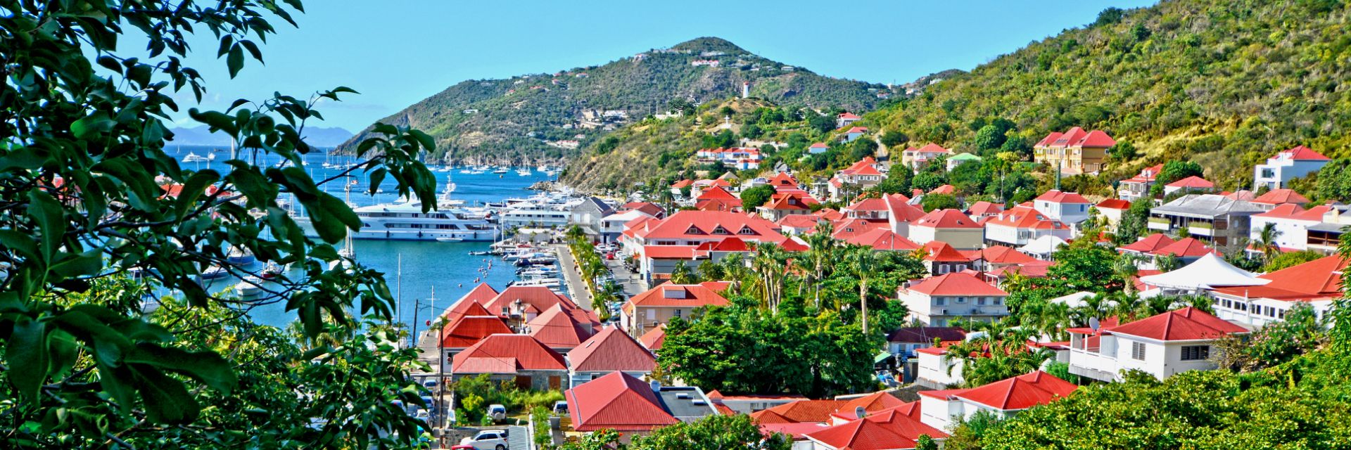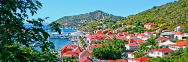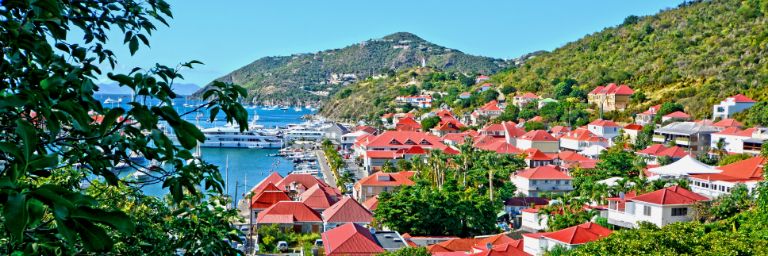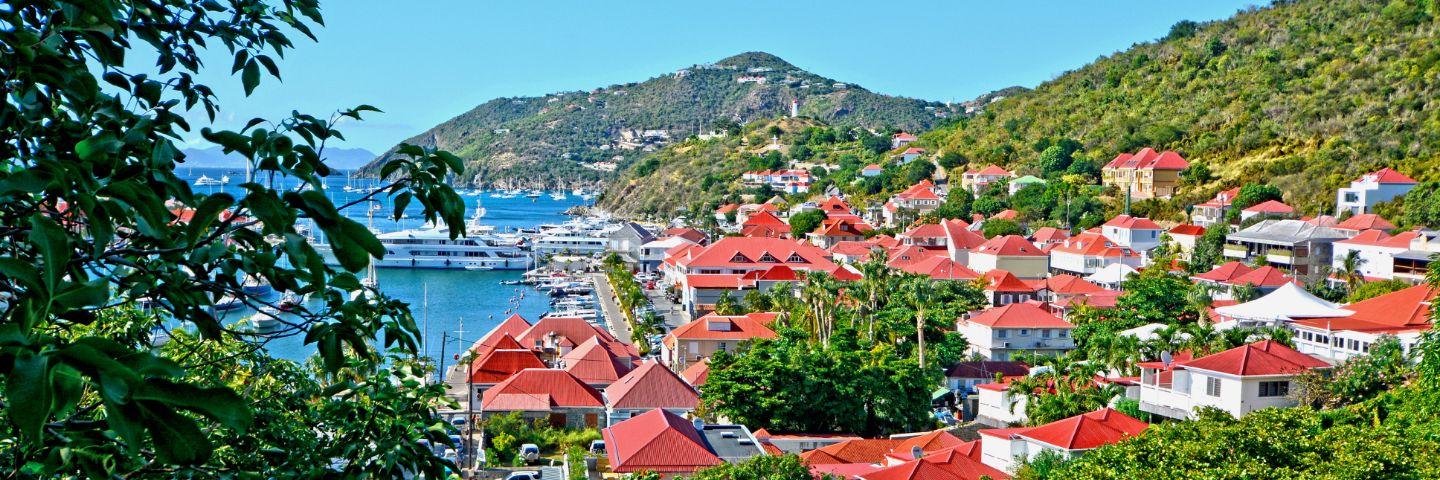 A town in the Caribbean with red roofs located right next to the water.