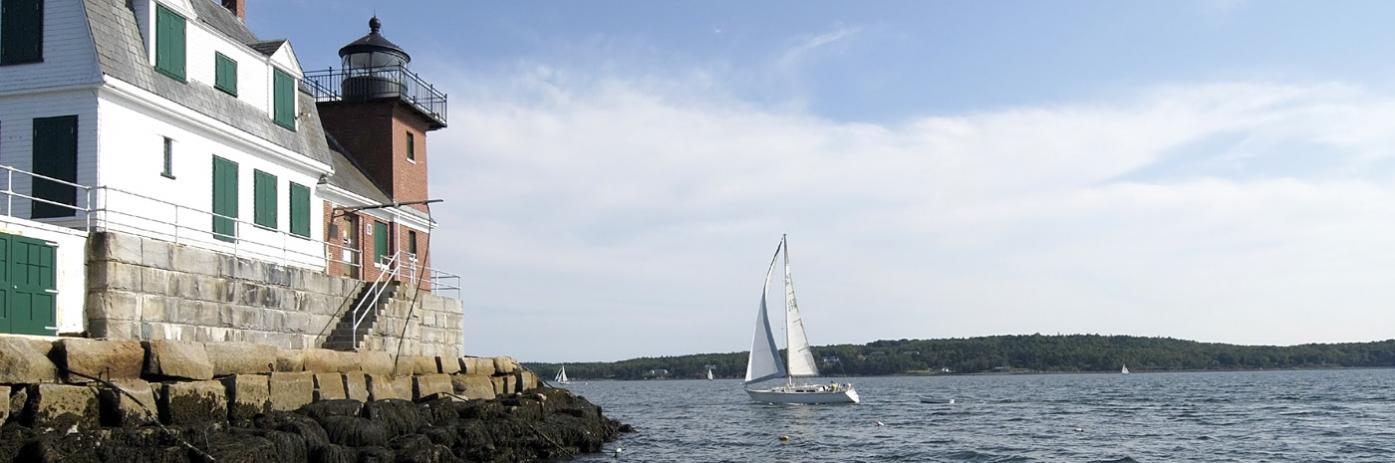 A rustic lighthouse in the foreground overlooks a small sailboat in the bay in Rockland, Maine