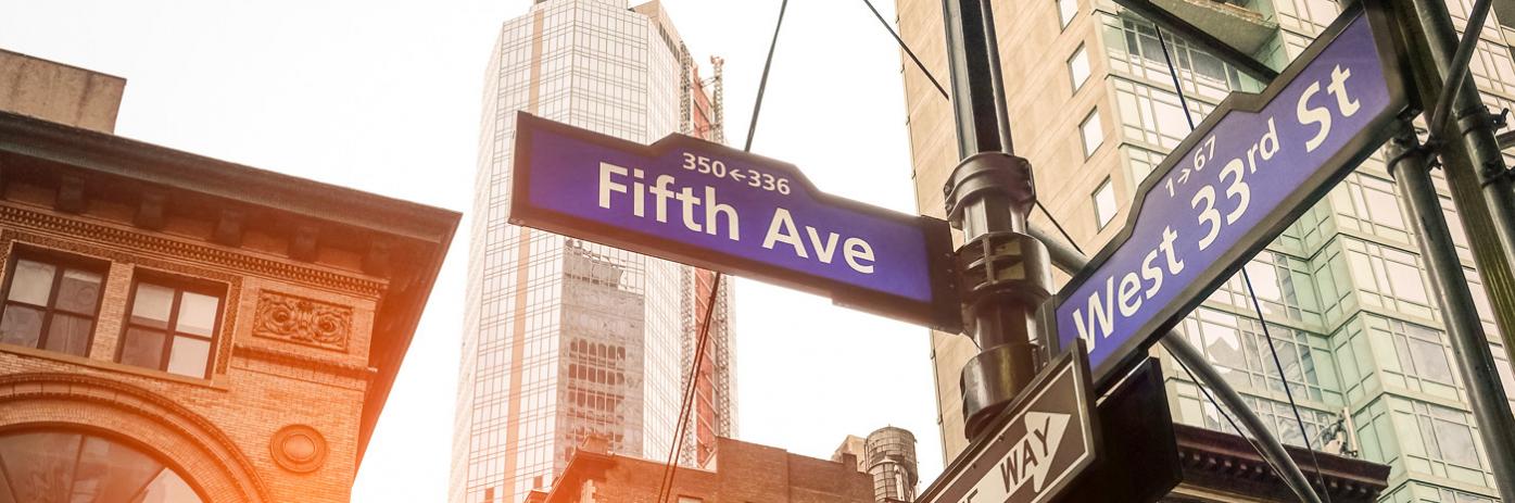 The corner of Fifth Ave and West 33rd St looking up into the skyline in Manhattan, New York