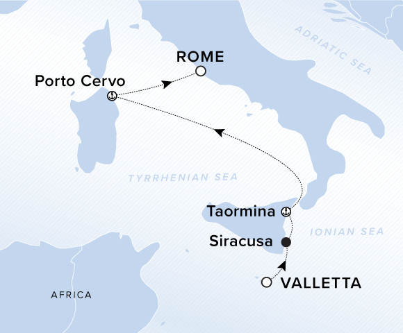 A map with a line starting in Valletta going to Siracusa, Taormina, Porto Cervo, and ending in Rome.