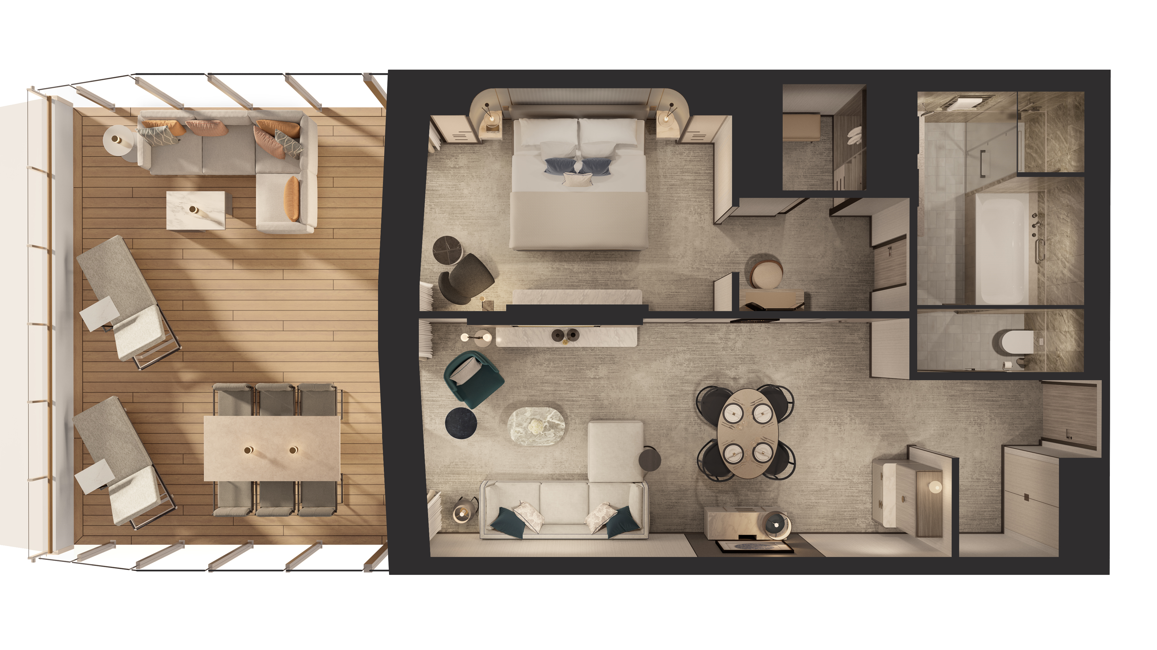 A floor plan of the Owner's Suite. A large wrap around terrace on the left, with plunge pool and deck furniture. Inside there is a living and dining room, bedroom, two large bathrooms, leading to the entrance on the right.