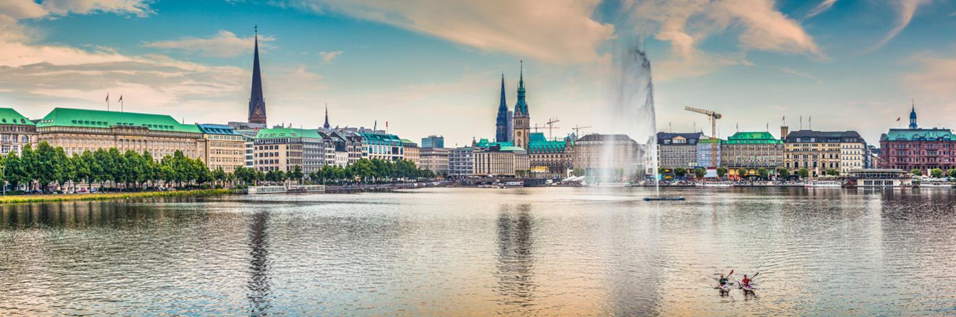 A fountain sprays up in the middle of the port, lined with buildings, and a couple in kayaks in the foreground.