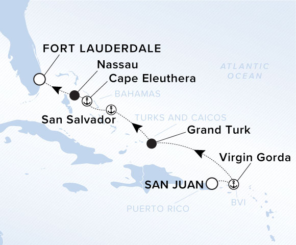 Unusual granite boulders form tidal pools on the beaches of Virgin Gorda, while Grand Turk boasts long, uninterrupted stretches of silky white sands. After contrasting these distinctive yet equally beautiful shorelines, set sail for three days in the Bahamas beginning with San Salvador, a mecca of dive sites, inland lakes, pristine beaches and deep-sea fishing.
