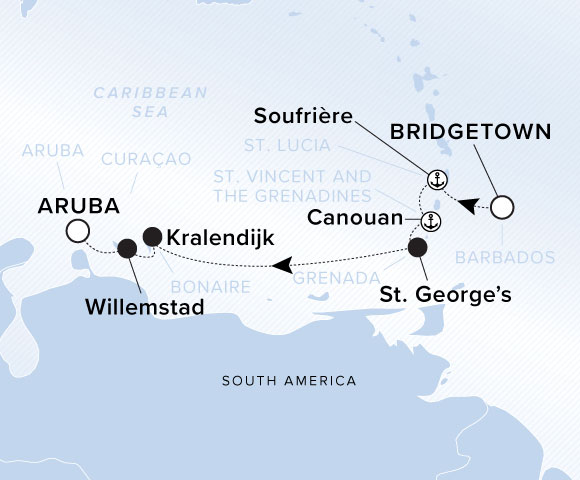The twin volcanic peaks of St. Lucia beckon you inland to find hidden waterfalls, while the white sands of Canouan keep you perfectly content shoreside at a private beach party. During three days in the ABC Islands, snorkel along the abundant coral reefs, explore the unique landscapes dotted with divi-divi trees, and observe the resident flamingos.