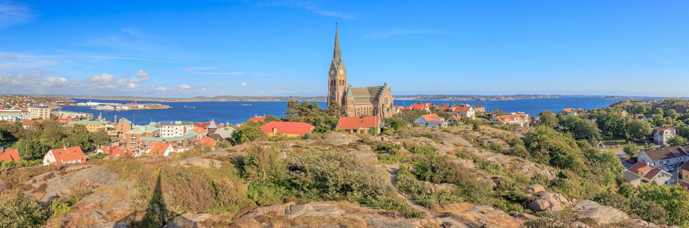 A church overlooks the quaint, coastal town of Lysekil with its terra cotta colored roofs
