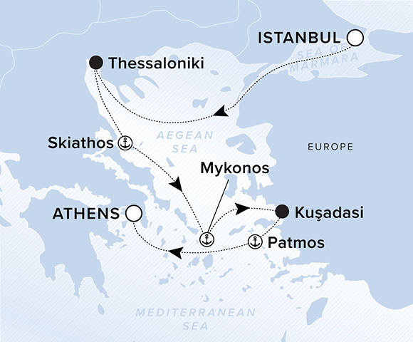 A map of the Aegean Sea with a line starting in Istanbul going to Thessaloniki, Skiathos, Mykonos, Kusadasi, Patmos and ending in Athens.