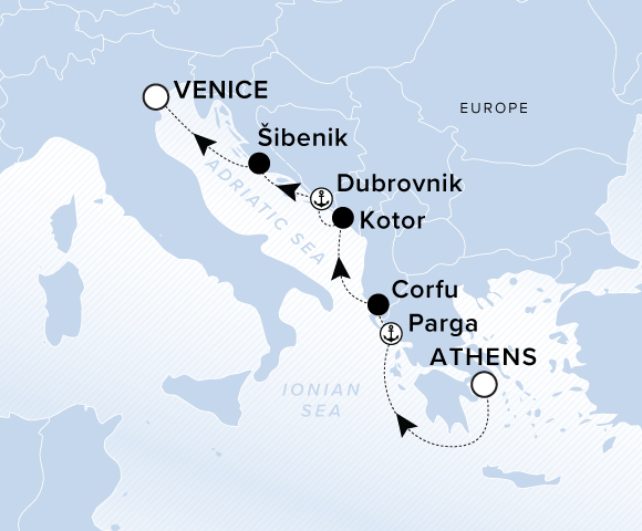 A map of the Adriatic Sea with a line starting in Athens, going to Parga, Corfu, Kotor, Dubrovnik, Sibenik and ending in Venice.