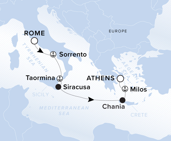 A map of the Mediterranean Sea with a line starting in Rome going southeast to Sorrento, Taormina, Siracusa, Chania, Milos and ending in Athens.
