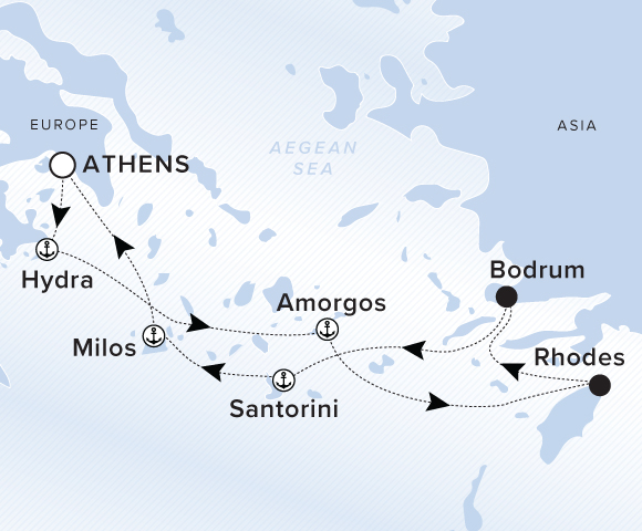 A map of the Aegean Sea and Greek Isles. A line starting in Athens going to Hydra, Amorogos, Rhodes, Bodrum, Santorini, Milos and ending back in Athens.