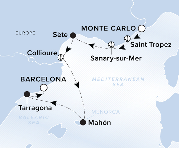 On the French Riviera, explore from Saint-Tropez to the canals of charming Port Grimaud and from Sanary-sur-Mer to the renowned wine region of Cassis. Both Sète and Coullioure offer access to the medieval city of Carcassonne, a UNESCO-protected fortress with massive ramparts surrounding its castle and Gothic cathedral. Then depart France for the Spanish island of Menorca and vibrant Barcelona.