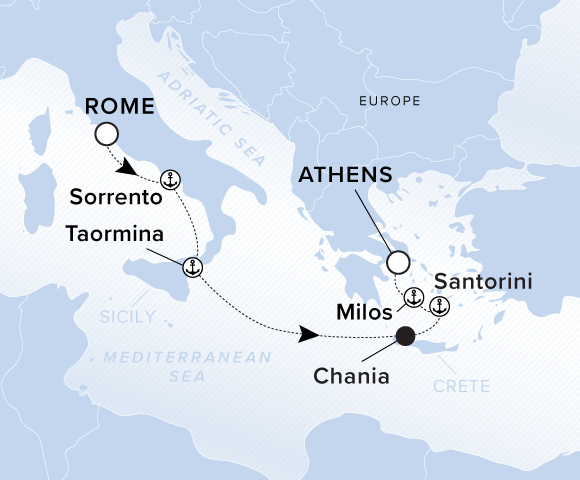 A map of the Mediterranean Sea with a line starting in Rome going southeast to Sorrento, Taormina, Chania, Santorini, Milos and ending in Athens.