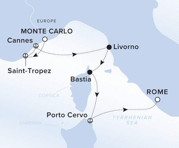 An overnight stay in Livorno allows time to explore the medieval hilltop towns along the countryside as well as the cradle of the Renaissance in nearby Florence. Along the French Riviera, Cannes provides a sophisticated scene for shopping designer boutiques and Corsica's Baroque churches and plazas invite visitors to stroll through history. Charming Porto Cervo's stylish social scene welcomes guests to the finest galleries and gourmet restaurants.
