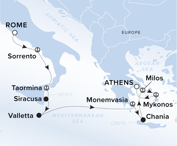 Sail along the Italian Riviera, taking in the picturesque seaside in Taormina and Baroque architecture on display in Siracusa. Then, go island hopping through the Greek Isles, exploring the museums and churches in Monemvasia and dancing the day away at the legendary beach clubs in Mykonos.