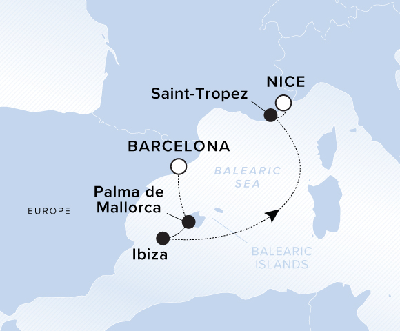 In Spain’s sun-drenched Balearic Islands, Palma’s massive Gothic cathedral heralds the impressive architecture that complements the beautiful beaches of Mallorca, and Ibiza is likewise renowned for its white sands and impossibly blue waters. Then sail for the glamorous beach resorts and designer shopping mecca of Saint-Tropez before concluding your voyage in Nice.