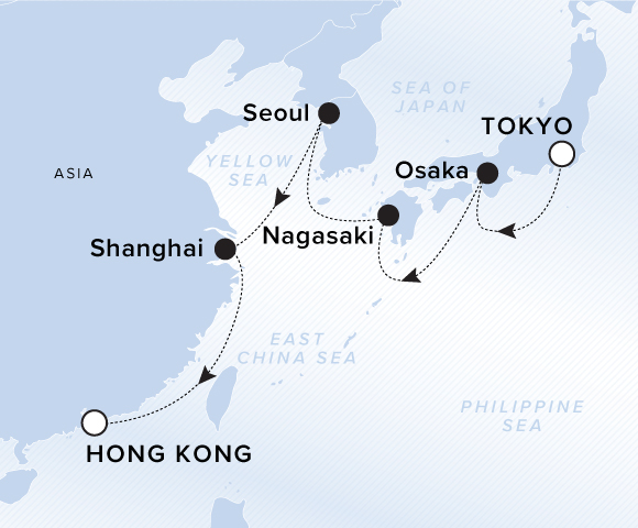 A map of the Philippine Sea, East China Sea, Yellow Sea and Sea of Japan. A line shows the voyage route from Tokyo, Osaka, Nagasaki, Seoul, Shanghai and Hong Kong.