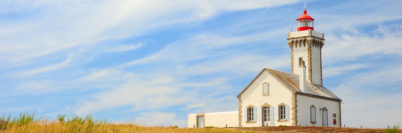 A grand white lighthouse with a red light tower surrounded by a pasture beneath a blue sky