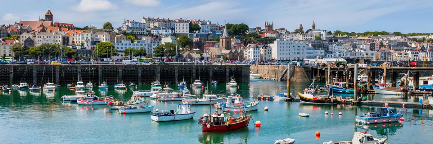 Bright blue sea filled with boats floating in front of a colorful shoreside town.