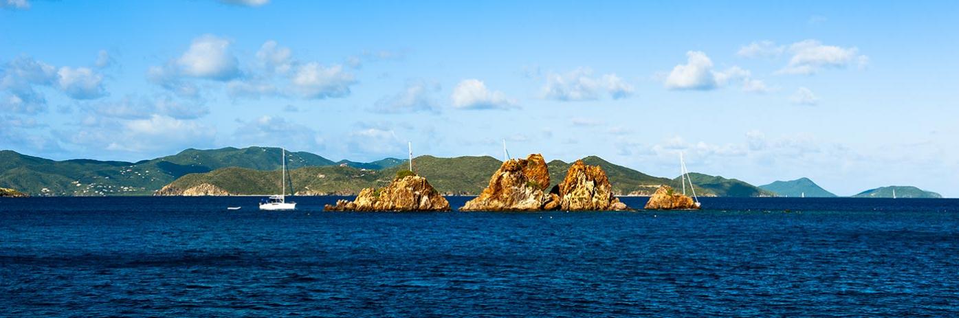 A rock formation protrudes from the ocean in the waters off of Norman Island
