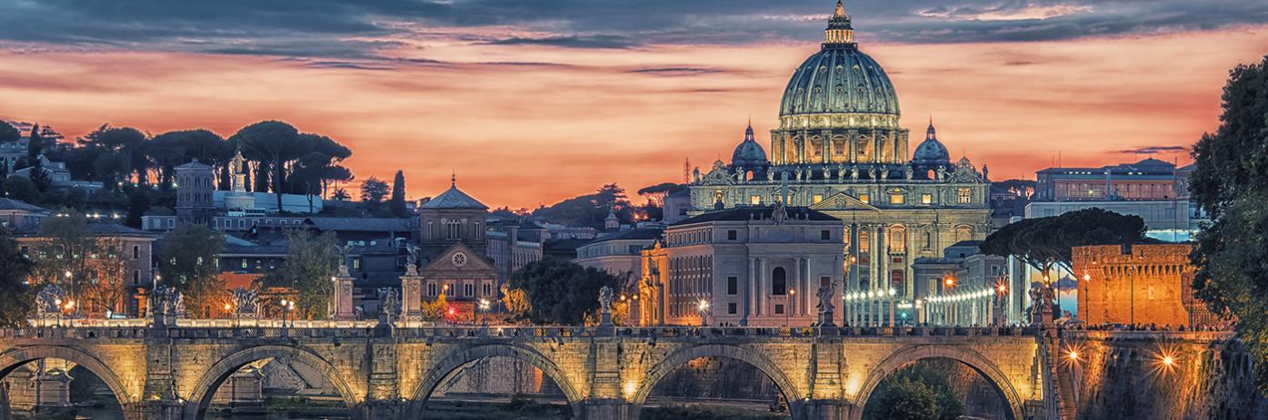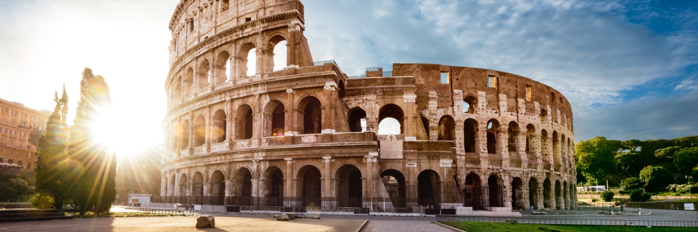A view of Rome's ancient Colosseum, with sun shining from behind.