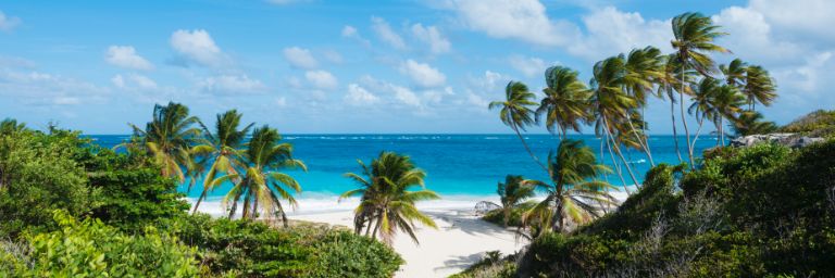 A view of the Caribbean Sea from the white sand beach with several palm trees in the foreground.
