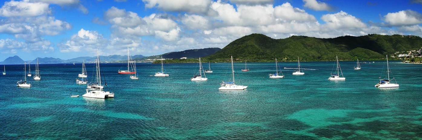 Sailboats scattered in the bright blue harbor with mountains and bright clouds in a blue sky.